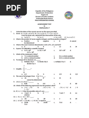 K To 12 Grade 4 Diagnostic Pre Test In Mathematics